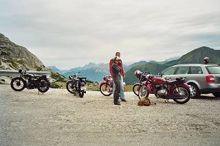 aus Untertürkheim, quasi bei Standard um die Ecke entstanden, hat sich auch sehr wacker geschlagen. 350 cm³ und 13 PS sind auch in den Bergen allemal genug. Satter Sound und super Durchzug, für einen 350 ccm Motor der damaligen Zeit sicher eher Oberklasse. Leider hat der wahrscheinlich durch langes Stehen verursachte Schmiermittelverlust an der Abtriebswelle dafür gesorgt, dass das Hurth - Getriebe am Abend des ersten Tages seinen Dienst verweigerte. Kupplungswelle und Abtriebshülse miteinander untrennbar verbunden, zu lange im kleinen Gang gefahren, Hülse auf der Welle heiß gelaufen, gefressen und Stopp. Wir haben versucht, es zu reparieren, aber fest ist fest, so dass die UT am zweiten Tag im “Stall” bleiben musste. Wer weiß, ob sie nächstes Mal wieder mit darf, ein Getriebe ist zwar organisiert, aber die Standard Rex wartet auch auf ihren ersten richtigen Einsatz. Na mal sehen.