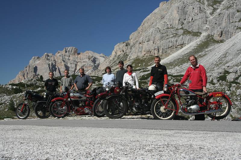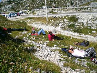Hintergründen findet man unter anderem HIER . Genau in der Mitte zwischen den beiden letztgenannten Pässen entstand unser Gruppenbild, welches wir während einer Pause in der Mittagszeit machten. Kurz danach sind wir zum Valparola - Pass gefahren um Pause zu machen. Man merkt, es war nicht der rechte Zug in der Gruppe, was aber an dem traumhaften Wetter lag. Es war ein Tag wie gemalt, kein Wölkchen verunzierte den Himmel. Abseits der Straße herrschte sogar Ruhe, es war einfach Klasse.